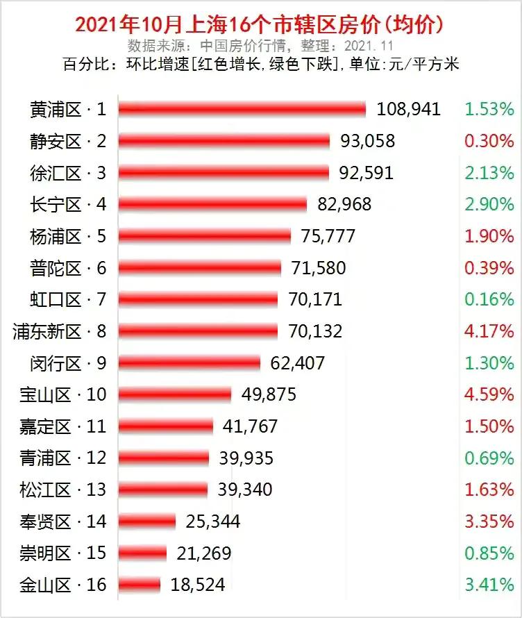 “魔都”上海吸引了大量的人口,在最新的七普数据中,上海人口达到2487.09万,为全国第2,仅次于重庆。尽管多年来很多人说要逃离上海,可往往是想挤入上海。从上海的房价来看,能够在上海安身的,确实都不太容易。即使是最低的金山区,在今年10月份,其最新房价也达到18524/㎡,和武汉、成都房价不相上下。最高的黄浦区已经突破10万元/㎡。从增速看,目前,上海16个区中,依旧有8区出现上涨,其中,浦东新区、宝山区涨幅较大。