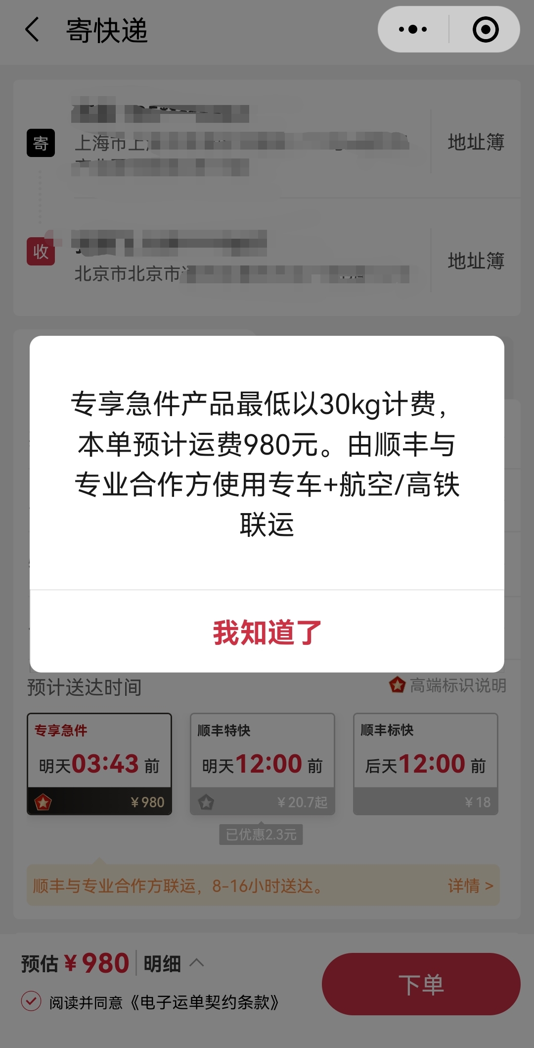 「急件顺丰」顺丰快递价格是多少(京沪运费980元起已开通8城)