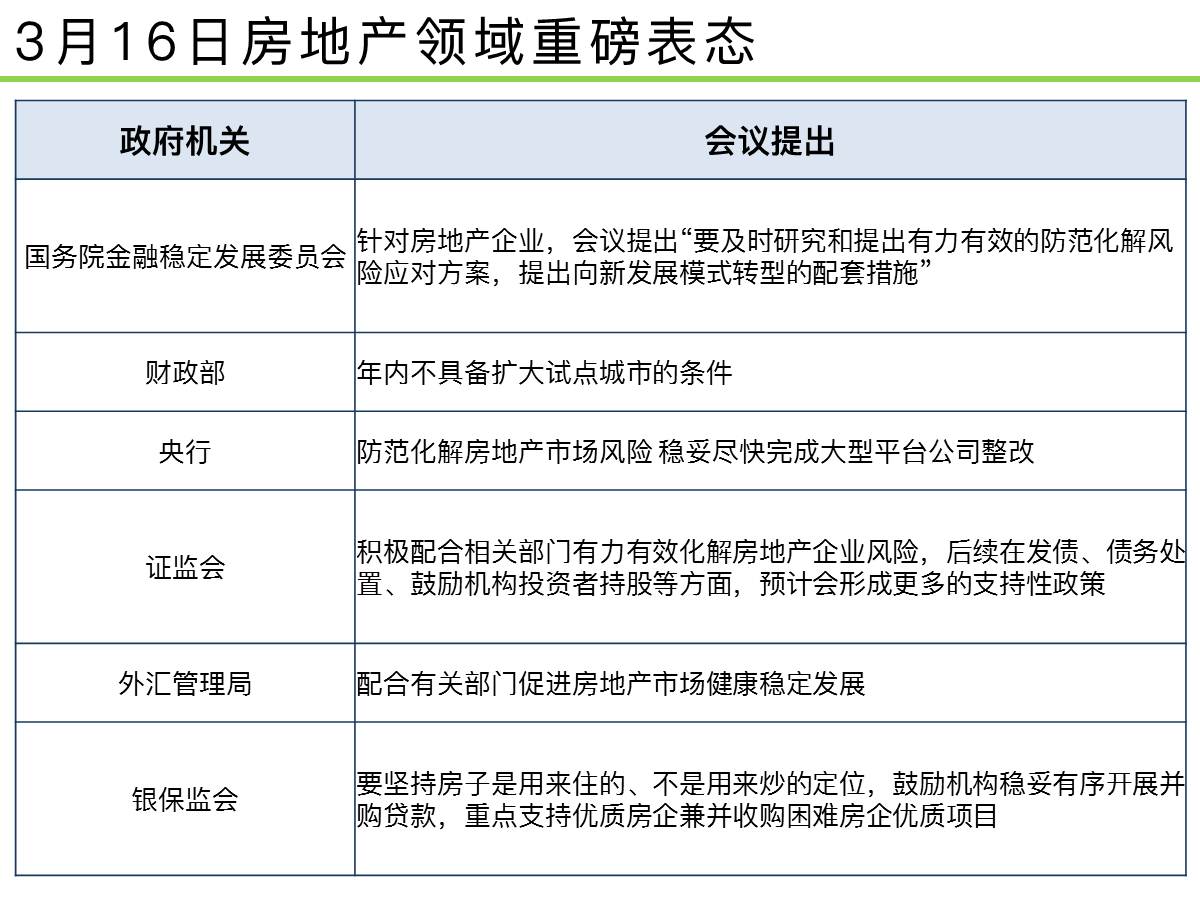 3月16日,金融委召开了专题会议,其中关于房地产的表述给市场打了一剂强心针。金融委提出,要及时研究和提出有力有效的防范化解风险应对方案。此后,央行、国家外汇管理局、中国证监会、中国银保监会和财政部纷纷表态,称将配合相关部门有效化解房地产企业风险,促进房地产业良性循环和健康发展。