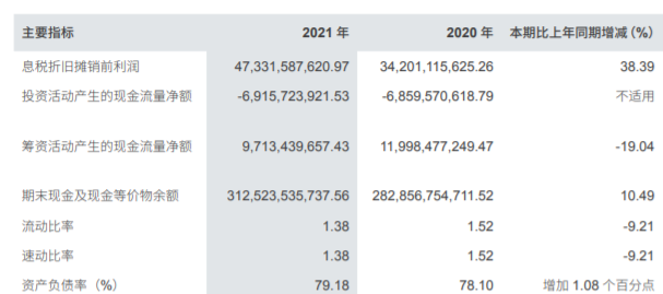 截至2021年末,中信证券的资产总额为12786.65亿元,同比增长21.44%;负债总额10648.57亿元,同比增长22.81%;公司资产负债率为79.18%,比上年同期增加1.08个百分点;流动比率1.38,比上年同期下降9.21%;速动比率1.38,比上年同期下降9.21%。