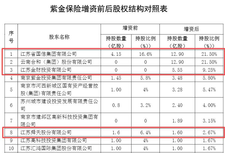 对比增资前后的股权情况,新增股东合和集团持股比例21.50%与公司原有第一大股东江苏省国信集团有限公司并列,成为公司的第一大股东,两者合并持股比例为43%。第二大股东变更为新增的金财投资,第三大股东变更为南京紫金投资集团有限责任公司。原有的第二大股东江苏舜天股份有限公司变更为第八大股东。由此,公司的股权结构发生重大的调整。