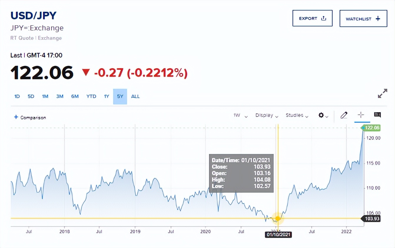日元兑美元的汇率,已经贬值到122,相比2021年1月10日的1美元兑换102日元,现在日本人要兑换1个美元需要多花20个日元。
