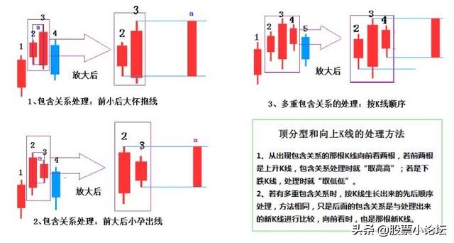 注意:这里重点说一下,分型是要处理完包含关系的。从出现包含关系的那根K线向前看两根,若前面两根呈上升K线关系,就取高高。若前面两根呈下跌K线关系,处理时就取低低。看图可能会更加清楚。