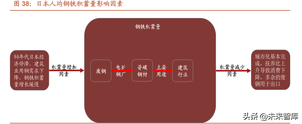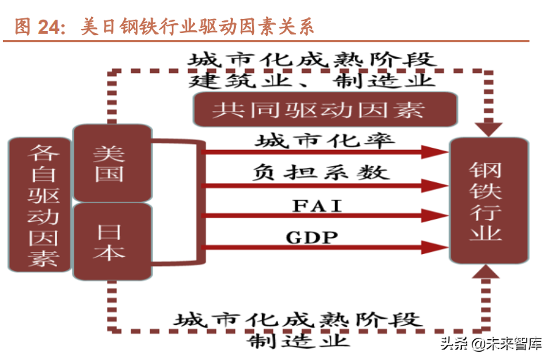 1、问题一:美、日钢铁业发展有什么共同特征? 大体上美国、日本钢铁行业的发展都经历了起步、高速发展、转型升级和波动发展时期。 从城市化的角度出发,城市化高速发展时期也就是城市化率从 40%左右上升到 70%左右,年化平均在 0.5 个百分点 以上的阶段,该阶段对工业、基础设施建设、住房等都提出了更高的需求,下游市场的需求会有效刺激钢铁行业的发 展,带来钢铁产量的较快提升。 城市化进入低速增长时期,即城市化率在 70%-80%的阶段,该阶段城市化率增速明显放缓,此阶段钢铁产量与城市 化相关性降低,该阶段美日都成为技术领先的发达国家,在全球产业链条有着明显的制造业竞争力,这促使产业链上 移、制造业优势增加,导致钢铁产量的增速和下游行业(制造业)的需求相关,制造业产出增加时,钢铁的需求会增 大,钢铁产量的增速也会提升。同时因为产能过剩问题的出现,钢铁产业内部对转型升级的需求也逐渐上升。 就人口抚养比而言,人口抚养比的上升对钢铁需求有一定的抑制作用;人口抚养比下降,人口红利影响会使制造业、 建筑业需求提高,用钢需求增大。此外,人口抚养比与固定资产投资同样存在较强的负向相关关系,人口抚养比越高 意味着劳动人口占社会总人口比重越小,消费和投资活动乏力,因此固定资产投资下降;人口抚养比降低则相对而言 会带来高消费、高投资的市场状况,固定资产投资上升。 同时,宏观变量之间也存在内在联系,固定资产投资的快速提升有力带动了城镇化建设,而固定资产投资与 GDP 之 间存在单向因果关系。此外,建筑业产值以及制造业产值与钢铁行业都存在很强的相关性。 2、问题二:美、日钢铁行业转型升级期的应对措施有哪些? 钢铁行业转型期指的是钢铁产业经过快速发展后,产能出现较为严重的过剩时期,该阶段钢铁企业普遍存在高能耗、 高污染、粗放式管理、产品偏中低端等问题。美日均通过降低环境污染,推动技术进步和促进企业兼并重组等措施, 推动本国钢铁行业的升级转型,并优化钢铁行业的产能和效率。此外,美国主要通过贸易保护措施,促进国内钢铁行 业的发展进步(但效果不佳),而日本则积极开拓海外市场,推动出口,日本海外公司的设立提升了日本高端钢铁的 海外需求。 (1)美国去产能措施:环境治理、贸易保护、技术突破、兼并重组 70 年代以来美国进入钢铁产能过剩时期,由 wind 公布的数据,美国在上个世纪 80 年代中期以前,钢铁产能利用率 波动幅度较大,年平均利用率约为 73.26%,从 80 年代末至 2008 年,去产能措施增效,产能利用率持续维持高位波 动,年平均利用率达到 85.17%,钢铁产能在 80 年代后期也出现了明显的回落,至 2008 年以后,整体利用率水平有 所回落,但年平均利用率仍然达到 72.68%。 为了实现钢铁行业转型升级,美国主要通过严格的环境治理措施倒逼不达标企业退出市场,同时通过实行贸易保护, 控制钢铁进口,助推技术突破,推动电炉炼钢的发展,通过兼并重组提高了行业集中度,化解过剩产能。 (2)日本去产能措施:技术改进、出口调整、兼并重组、污染治理 日本钢铁行业 70 年代出现严重的产能过剩问题,该阶段日本的钢铁消费量在 7000 万吨左右,而日本粗钢产量则在 1 亿吨左右呈现波动趋势。日本钢铁行业产能指数也达到最高值 115(以 2010 年日本钢铁产能为基准=100),此后, 日本钢铁行业产能指数整体呈明显下降趋势,到 2020 年,该指数下降到 94 左右。1977 年以后,日本的钢铁行业去 产能措施主要有技术改进、出口调整、兼并重组、污染治理等,但不同阶段的重点措施不同。 3、问题三:美、日人均藏钢量和电炉炼钢发展的联系? (1)美国人均藏钢量整体呈现上升趋势,2019 年高达 14.9 吨 钢铁积蓄量是指一个国家实际上拥有的金属资产中的钢铁总量,是钢铁生产和使用的阶段性积累,具体计算方式是钢 铁积蓄量=Σ 钢材实际消费量-间接净出口量-社会回收废钢量+进口再生钢铁原料。 美国人均钢铁积蓄量整体呈现缓幅上升趋势,根据人均钢铁蓄积量年均人均增长情况大致可分为两个时期,70 年代 以前、70 年代后半期至今。70 年代以前人均藏钢量增速相对较快,1935 年至 1970 年,美国年均人均藏钢量增长 0.12 吨,1935 年美国人均藏钢量约为 7 吨,此时总体体量达到 9 亿吨,到 1955 年,人均藏钢量突破 9 吨,整体增势平 稳,至 1965 年人均藏钢量突破 10 吨。进入 70 年代以后受产能过剩、需求疲软的影响,人均藏钢量增势稍弱于第一 阶段,1971 年至今年均人均藏钢量增长 0.07 吨。自 90 年代后期开始,美国钢铁行业转型升级,产能利用率维持高 位,美国人均藏钢量突破 14 吨,2019 年升至 14.9 吨。 受产能过剩的影响,80 年代美国人均藏钢量约 12 吨左右,废钢储量的不断提升也促使了短流程钢厂大规模出现,短流程钢厂有低成本、高效率的特点,相对而言布局也更为分散,规模较小,其拥有的灵活优势对长流程钢厂 的发展带来了严重的打击,短流程钢厂迅速获得市场的青睐。 (2)日本人均藏钢量持平 20 年后迎来增长,2019 年人均藏钢量达 11 吨 日本人均钢铁积蓄量经历了一定时期的较快发展后进入明显的持平期。60 年代由于日本国内废钢资源的严重不足需 要大量进口废钢,但国际废钢供给不稳定,因此该阶段日本控制电炉炼钢的比例。日本电炉厂在 1973 年石油危机时 对产品结构和设备进行了合理化改造,1