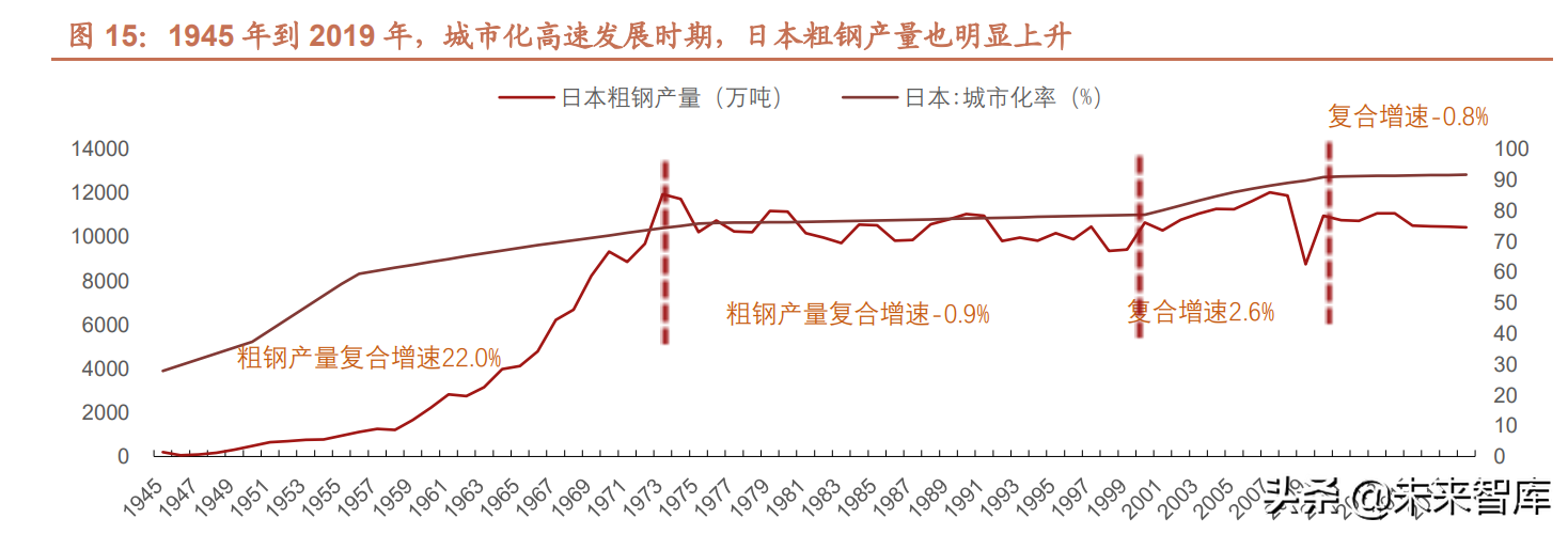 第一阶段为 1945 年-1973 年,日本城镇化率从 28%增长到 74%左右,年均提升 1.64 个百分点,粗钢产量的年均复 合增速也高达 21.97%。该阶段日本粗钢产量的增长和城市化水平相关系数高达 0.71。城镇数量和规模的增长导致基 础设施建设空间扩大,从需求侧抬升钢铁产量。特别地,1945 年-1951 年,日本城市化率几近翻倍,但钢铁产量增长有限,这是由于日本受二战战败影响,钢铁行业的投资经历了逐步合理化的过程,因此前期粗钢产量增速有限。第 二阶段为 1974 年-1999 年,日本城市化率提升约 6 个百分点,城市化率年均增幅仅为 0.25 个百分点,城市化进程趋 缓的背景下,日本粗钢产量呈波动下降的趋势,复合增速为-0.87%。