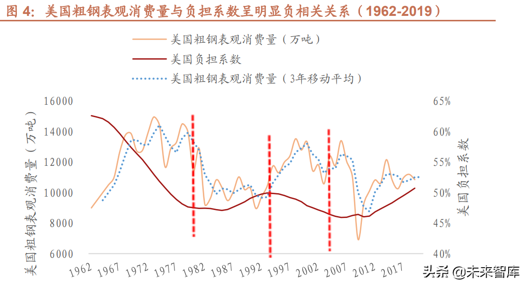 人口负担系数也称抚养系数、抚养比。是指人口总体中非劳动年龄人口数与劳动年龄人口数之比。1967 年至 2019 年,美国粗钢表观消费量和负担系数整体呈现较强的负相关关系,人口抚养比下降基本伴随着钢铁行业消费需求的提 升,总体上以人口抚养比拐点为依据大致可以分为四个阶段。