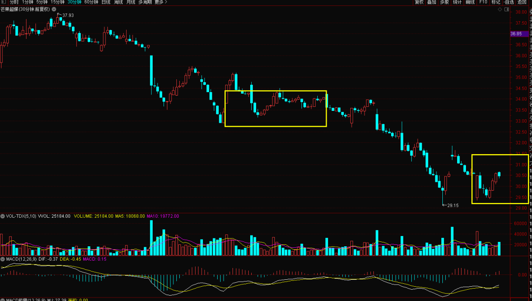 1. 先看30分图,可以看到前3根K线就构成了中枢