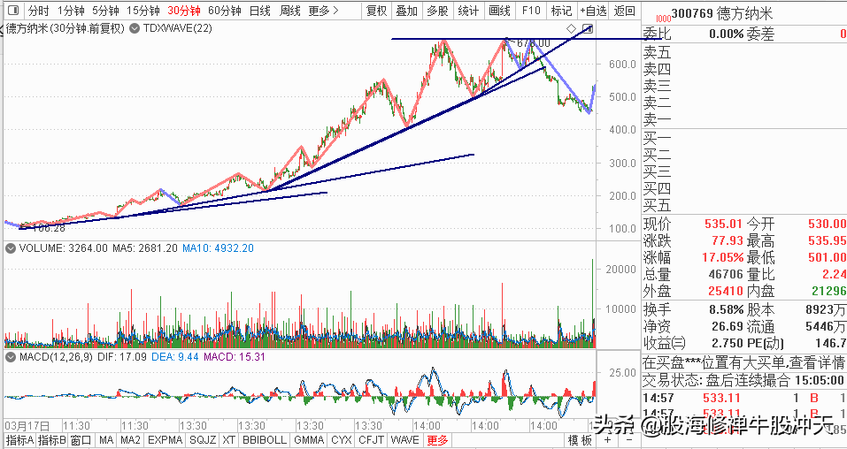 一、一目了然识别当下的走势是属于上涨结构,还是下跌结构,还是整理结构。 二、当下结构是在良性的延续中,还是转折中,原有的结构正在被破坏。 如下图,上涨结构的破坏,与下跌结构的破坏。 三、结构延续,或是破坏的关键位。 强弱看前高,结构看前低。 K线结构可以运用级别的思想。 例如日线的上涨结构中的一段下跌,放在30分钟,或者5分钟周期图中,可能就是对应单边下跌结构 例如日线的整理结构,放在5分钟周期图,可能就是单边上涨结构和单边下跌结构的不断相连。 透过现象看本质,向较与单根K线,其表达的是对一段走势多空力量的表达,强弱状态的捕捉。在分析实战时,可以结合量能,MACD,MA均线等基础指标进行分析。 单根K线的分析,除强弱和位置外,从属于结构本身,也是非常重要的。 案例分析: 益佰制药,2021年11月10日跟踪以来。 大结构,小细节。本质上就是对不同周期,不同级别的运用。即要有大局观,有大视野。又要能捕捉的细节的变化。 大结构,其2019年2月1日的历史低点3.82以来。大结构就是震荡整理。当下是突破与确认的阶段。 小细节,2021年11月10日,当时5均,13均,纷纷上穿144天均线,符合三线操盘的趋势拐点。从2021年11月10日以来,当前涨幅40%。 技术分析时,越是基础的,往往越重要。难能可贵的是足够深入。浅尝辄止地了解其皮毛,人人都能会,但是非常深入,就不易了。 技术分析,交易,没有那么复杂,以益佰制药为例。11月10日是三线操盘的进场点。当前仍属于单边上涨结构中,且量能配合。5均,13均,144天均线多头排列中。只要保持此状态不被破坏就可以继续持股。反之,如向上偏离5均线,短线卖,波段减,底仓可守趋势。待破位趋势线了,或破13日均线之后,站不上。波段走坏,可以离场。严格按照三线操盘的交易口诀应对即可。 如果把连续的4篇文章都有反复品读,理解, 那么在个股跟踪的过程中,一阴一阳的K线映入眼帘时,就建立起了立体的思维 ①K线,一时强弱的表达 ②K线,所处的位置。从属于通道内,不管是整理,缓涨,下跌,有无打破平衡,有无突破性质。如在通道内,仅仅是强弱的表达。如是打破平衡就要格外注意。 ③K线,结合其结构。 这样就有利立体的思维。同时,如果再结合多周期的视角,那么走势还是那个走势,但是在你的眼中,已经变得不一样了。走势会说话,但是只会对有情人说巧巧话。有心的人能听懂,更多的人听不懂。如此而已。 最后,对于粉丝朋友一点建议,也是共勉。 对于一门学问,方法,千万不要还刚刚触及到一些皮毛,就觉得不过如此,轻易自满。