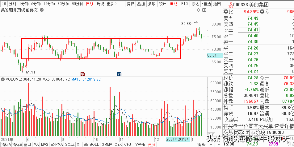 翠微股份,从2021年11月26日之后,一直到12月31日,期间股价在144天均线上方,不破144天均线。K线状态,为一阳不破状态。结构为震荡整理,直到2022年1月4日,再次涨停,又一次打破平衡,为平台突破。