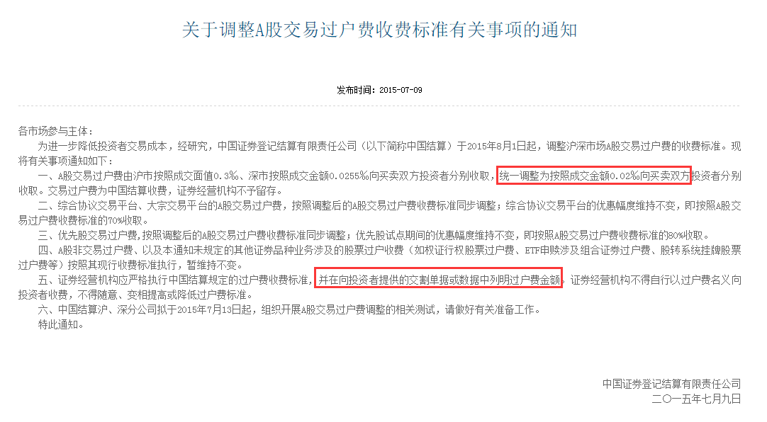 很多券商并没有把深圳过户费单列出来,是因为他们的交易系统太老,并不代表不收取,这也算是券商服务不到位的表现。看看下面的中登公司的文件,重点是二条,一是沪深都收过户费万0.2,二是券商必须单列过户费收费明细。