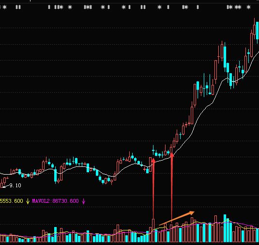 BBI白色线处于上升趋势中,最起码需要走平行,不要追涨,只看缩量小K线回踩的个股,每次回踩不破成交量出现缩量,可适当买进,注意:在上升途中成交量放量不涨停,偏离白色线太远,需要获利出来,等缩量回调可以再次介入,看下图