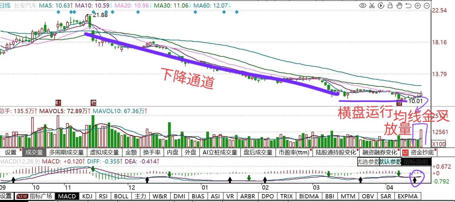 逻辑:研发实力位居我国汽车行业第一的国产汽车集团。长安汽车当前处于下跌趋势中,股价来到10.01处开始有止跌企稳迹象,横盘几日后昨日放量上行,股价站上20日线,5日线上穿10日线形成金叉,并对股价形成支撑,MACD保持金叉,短期趋势转强。