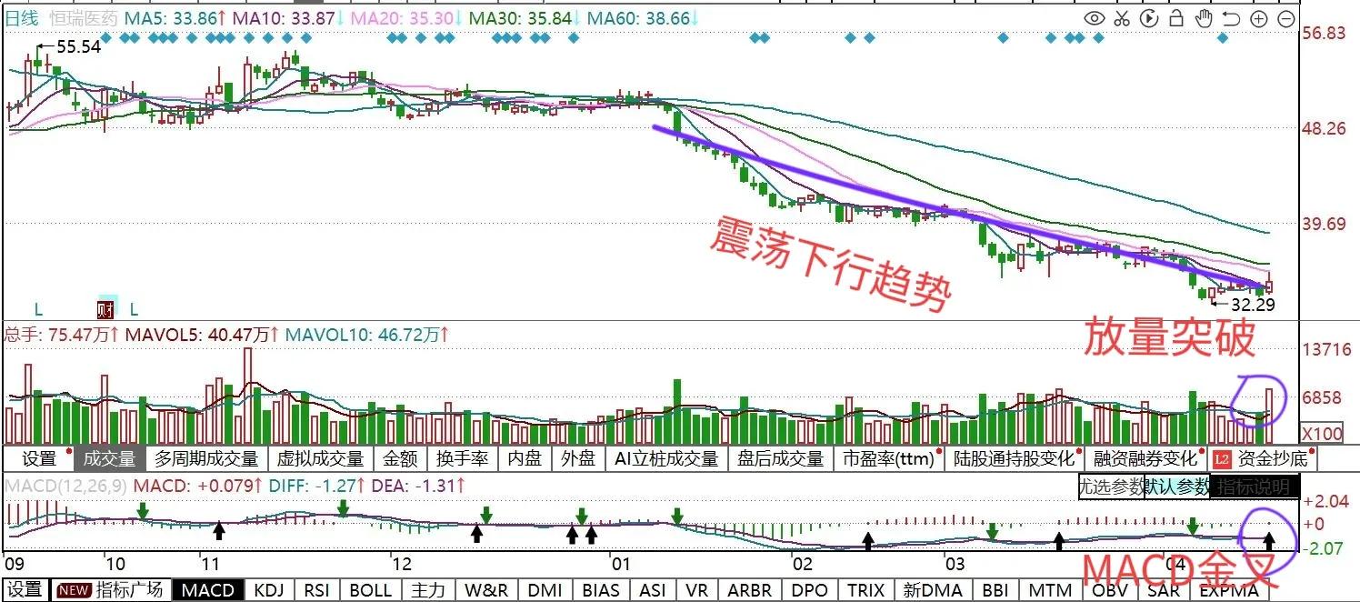 逻辑:国内化学制药实力第一。恒瑞医药很长一段时间处于震荡下行的趋势之中,近期来到短期低点32.29处横盘整理,昨日量能放大,股价随之上行,突破5日线和10日线,当前位置看股价面临20日线压力,但5日线即将上穿10日线,MACD金叉,短期趋势转强。