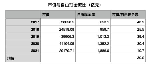 计算终值之前,我们一般需要先计算过往市值比自由现金流的平均值: