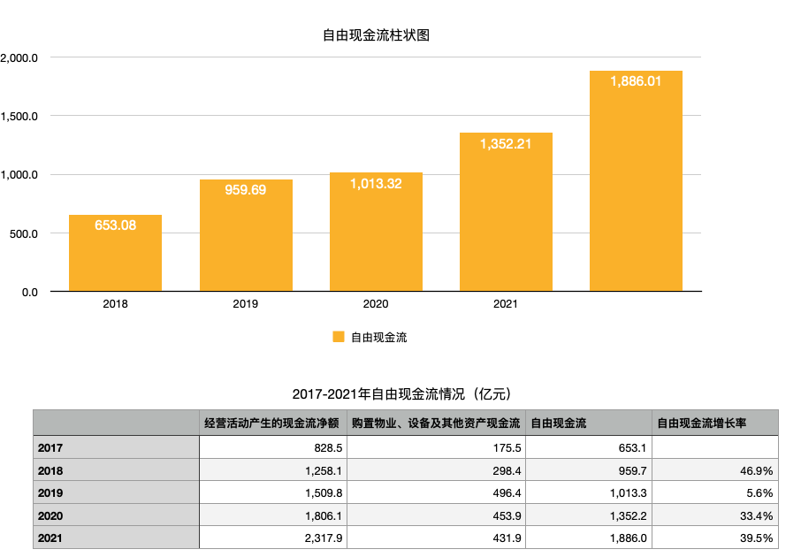 从2021年的现金流财报上我们找到经营活动产生的现金流量金额是2317.86亿元,而购置固定资产和无形资产的现金流量合计是431.85亿元。计算自由现金流的方式也很简单,用前者减去后者,因此2021年的自由现金流为1886.01亿元。