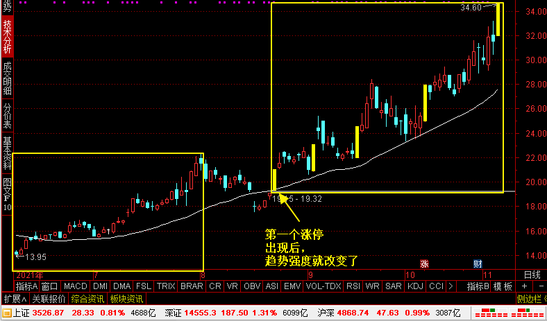 很明显,当图上第一个涨停K线出现后,整个趋势的强度就改变了。趋势明显变强了。