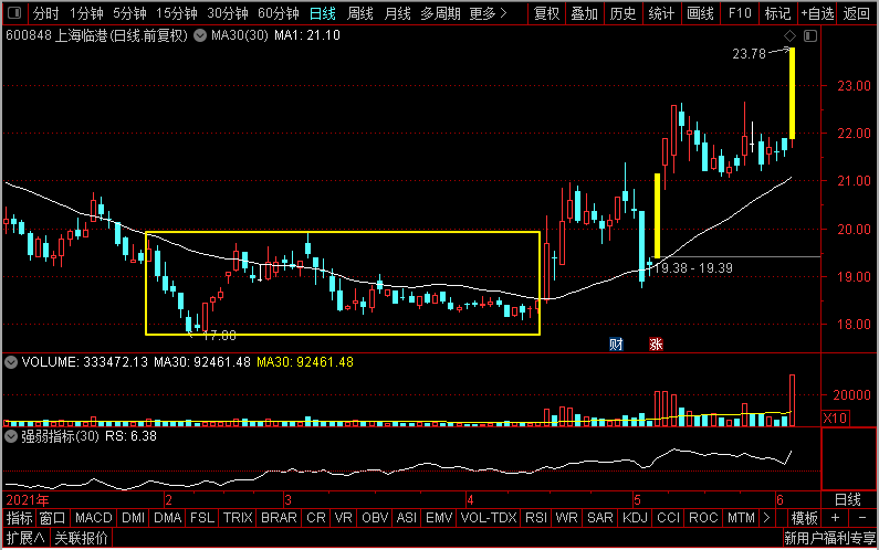另外,从成交量方面来看,上海临港,下方的成交量呈现出了放量上涨,缩量回调的态势,量价配合良好。