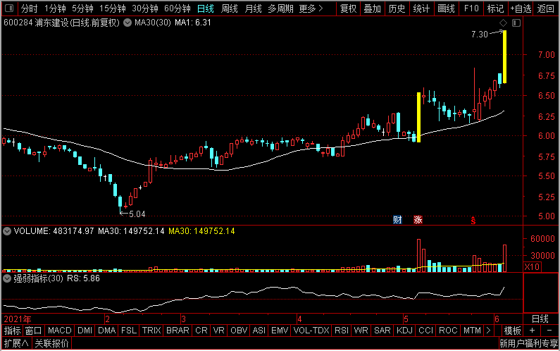 浦东建设,在6元附近横盘整理了一个多月就突破6元开启行情。
