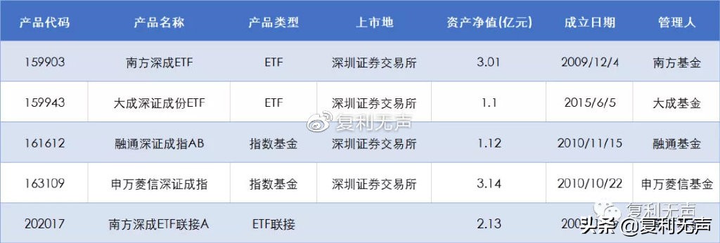 根据国证指数官网和天天基金网数据显示,目前追踪深证成指的基金共5只,其中ETF两只,ETF联接一只,指数基金两只,5只基金总规模约10亿人民币。