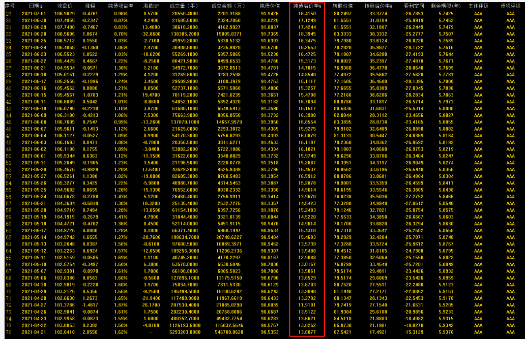 上市首日的溢价率为13.60%,今日收盘溢价率为15.83%。因此牧原纯债上市首日按照15%的溢价率,转债价格89.62*1.15=103元,20%的溢价率价格为107.54元。