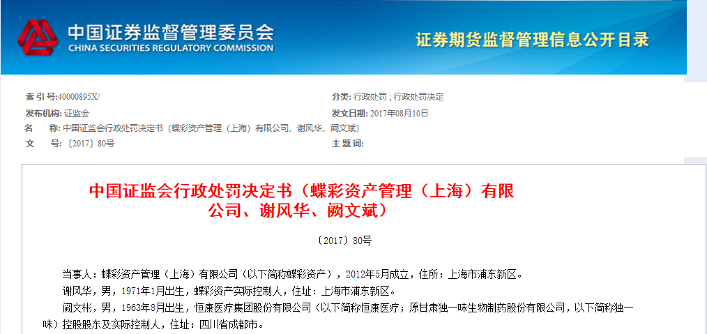 据证监会公开信息,2013年,阙文彬向蝶彩资产实控人谢风华提出,希望高价减持恒康医疗的股票。谢风华表示可以通过“市值管理”的方式提高恒康医疗“价值”,进而拉升股价,实现阙文彬高价减持“恒康医疗”的目的。