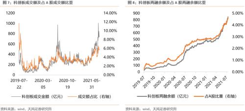 科创板成交量继续放量。7月26日至8月6日,科创板日均成交额为802.44亿元,较上周环比上升260.47亿元,占全部A股成交额比重上升至5.86%(前10个交易日为4.54%)。从成交额历史分位来看,科创板成交额历史分位数上升至99.1%的水平。在两融余额方面,本期继续上升至808.45亿元,占A股两融余额比重也进一步上升至4.62%(前10个交易日为4.21%)。