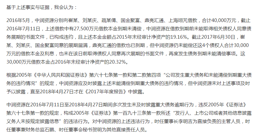 此3亿元借款本金占2016年末经审计净资产的20.32%,但中润资源未对上述事项及时予以披露,直至2018年4月27日才在《2017年年度报告》中披露,且在2016年7月11日至2018年4月27日期间多次发生未及时披露重大债务逾期行为,已构成违法行为。故中国证监会拟决定对中润资源及相关责任人给予警告,并各处以罚款。