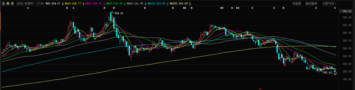 阶段二是6月份至今。到了6月初,五粮液似乎涨不动了,股价一路下行,最低跌至192.43元,跌破200元关口。