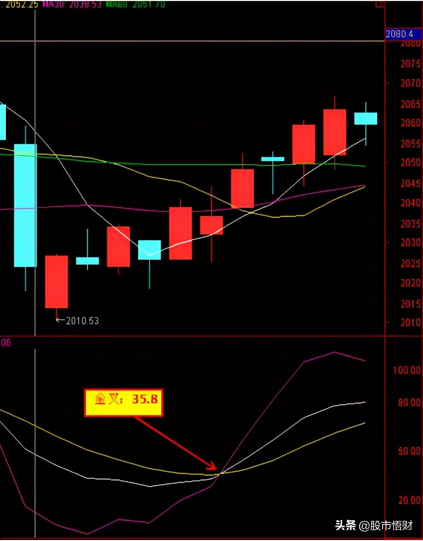 如图:上证指数2014年6月27日,KDJ金叉=35.8