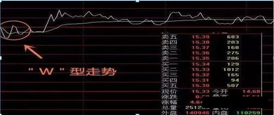 "W"型走势:与"N"型走势类似,不过是多了一次探底。分时图形成一个"W"走势。