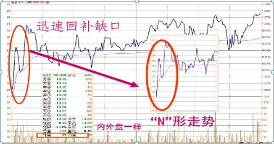 "N"型走势:即开盘后股价快速上冲后又快速回落,随即又快速上冲,分时图上出现一个"N"字走势。