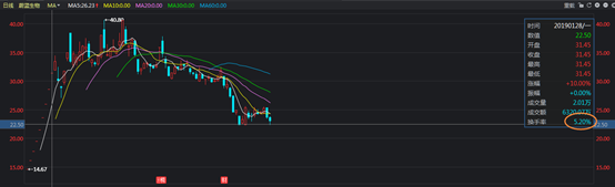 以蔚蓝生物为例,2019年1月16日上市交易,之后连续9个交易日涨停,在1月25日时换手率为0.63%,股票继续涨停,第二个交易日即1月28日换手率达到5.2%,换手率超过1%,于次日1月29日打开涨停板。