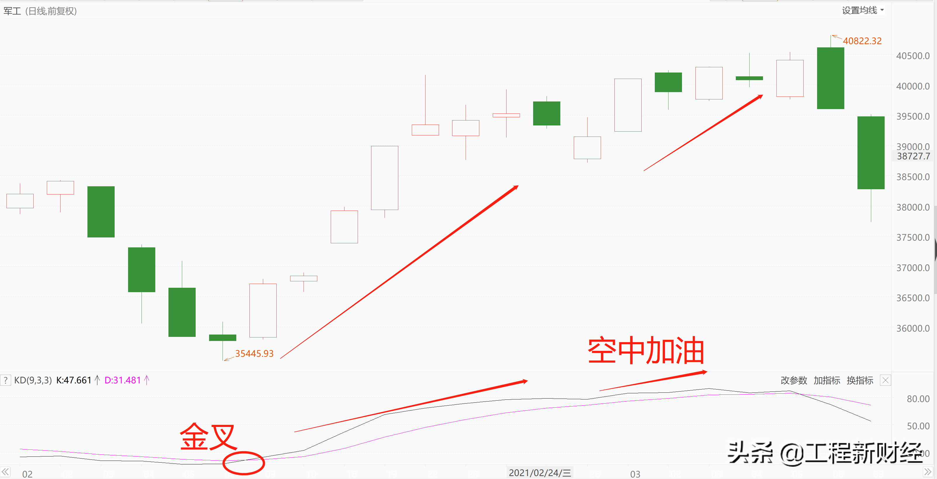 以军工板块为例,去年二月中旬KD指标在20附近迎来金叉,进而在二月下旬及三月上旬开启了一波涨势,通常一波行情持续10-12个周期,而此波行情中间又出现了空中加油的情况,延续的时间更长,达到了14个周期,期间如果按照KD指标买进和卖出的话将会获得一个可观的波段收益。