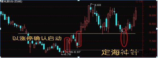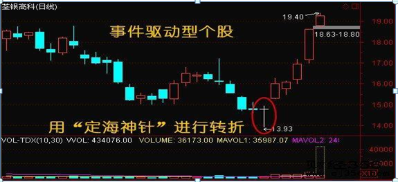 定海神针是什么?就是震幅在7个点之上的长影线K线,这是极为明确的转折信号,在支撑位配合定海神针,那么股价一定会向上转折。