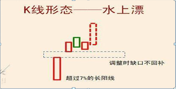水上漂有两个特点,1.调整或下跌过程当中,出现超长光头阳线,幅度要在7个点以上。2.第二日出现向上跳空缺口,并且调整时三天内缺口不能完全回补。