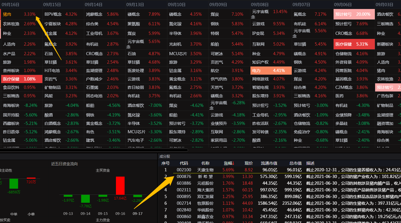 比如9.16日,最强势的板块就是猪肉股,龙头将在新希望和天康生物中诞生,可惜9.17日两个都没有涨停。(一般二板定龙头,龙头股完成二连板,将激发更多资金进入该板块,让该板块持续走强)