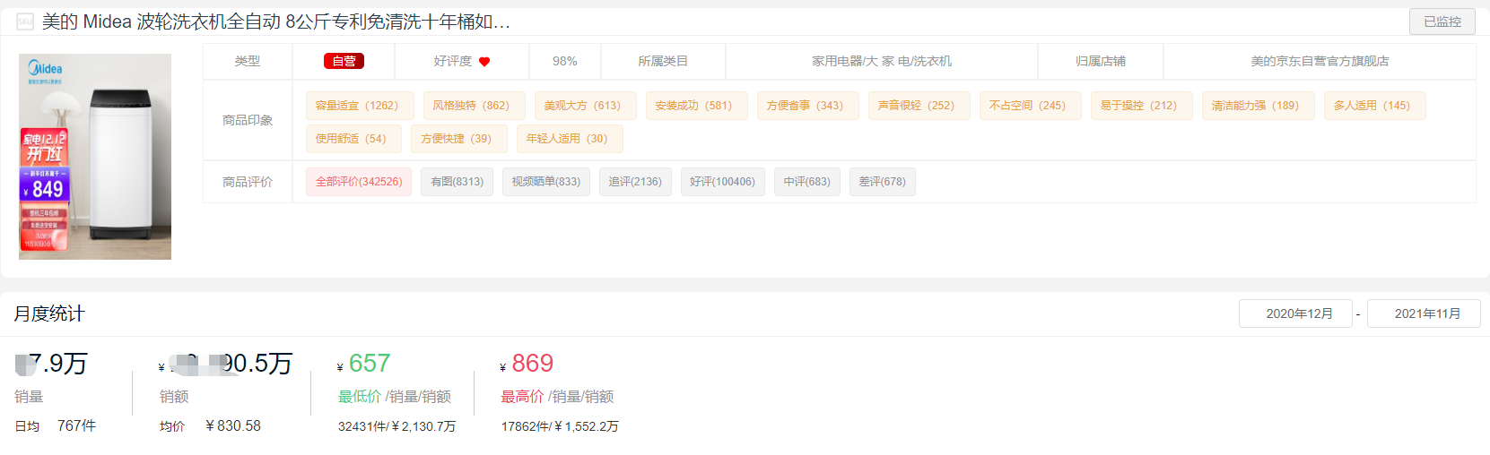 通过热销商品的监控,我们统计到小天鹅最热销的商品一样是“8KG的租房神器小功率波轮洗衣机”,2021年在京东平台累计销售约15万件,累计销售额超1.4亿元。该款产品的历史最低价曾低至788元,最高为959元,与海尔同款热销产品价格相近。