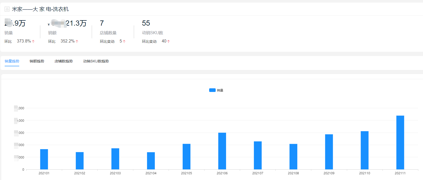 因此,鲸参谋综合了京东平台大家电——洗衣机品类下各品牌的销售量和销售额数据,同时结合洗衣机畅销商品数据情况,筛选出入围2021年洗衣机年度热榜的TOP10品牌。(以下数据均来源于鲸参谋平台,数据截至2021.11)
