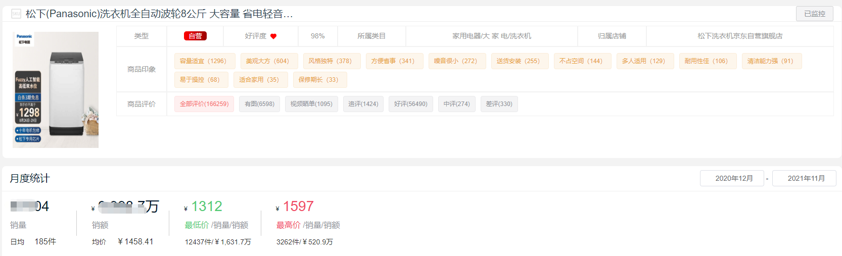 今年,松下全自动8公斤波轮洗衣机是年度热榜第一商品,在京东平台累计销售超6万件,累计销售额达8000多万元。该款产品历史最低价曾低至1312元,最高为1597元。在一众小功率洗衣机中,松下这款产品的价格相对较高。