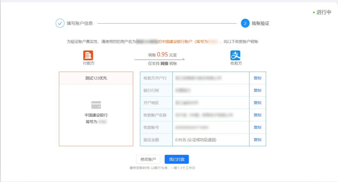 温馨提示:1)请你使用与认证资料填写的同名对公银行账户进行打款,请勿使用个人银行账户进行企业打款认证;2)请您使用大陆银行卡,外资银行将存在认证失败风险;请您在使用网银操作时,可使用打款认证信息页面复制功能,确保信息填写正确,您操作时请务必核对;3)收款方开户行信息“浙江网商银行股份有限公司”也请务必填写完整,可以点此链接查看开户行信息在各网银系统的填写示例,请勿填错 “浙商银行”、“网商银行”、“浙江网商银行”等。4)此次我方的收款账户仅用于认证账户,后续账户余额充值,请勿打款至该账户,避免金额无法退回。5)打款时,请务必将收款方信息填写正确,点击待打款页面收款方信息右方的复制按钮,可以粘贴填写至对应网银系统的收款方信息,请勿填错 “网络”填错“网路”、“技术”填错“科技”等。6)支付宝收到资金后,认证状态实时更新,认证成功,则资金会退回您的支付宝账户。若您打款后,对公银行账户收到退款,则说明认证失败,不成功原因一般为填写的收款方信息有误导致,您可将打款的电子回单与待打款页面的收款方账户信息核对,填写正确信息再次打款。完成企业实名认证后,企业支付宝账户即可正常使用。