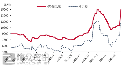 2020-2021年NPG与异丁醛价格走势对比