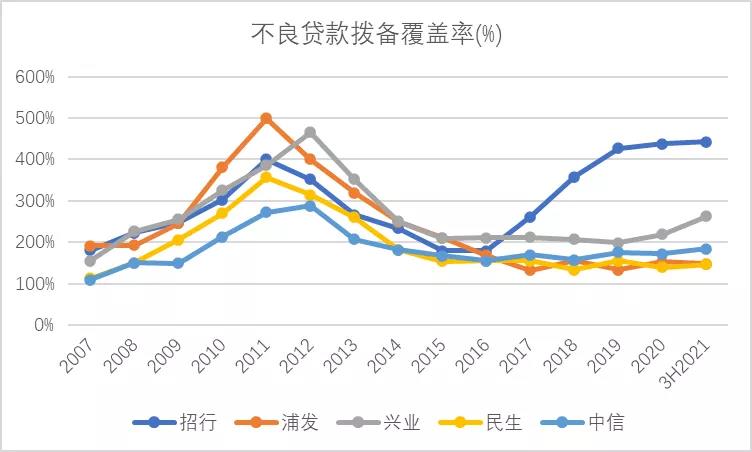 在2016年出现了分水岭,招行及兴业的不良率持续下降,民生、浦发及中信的不良率则不断攀升。对于浦发,有成都分行事件的影响,也有部分业务发展过猛的因素。对于民生,一直以来的高风险偏好,在经济下行周期风险爆发。对于中信,风险事件频发,诸如“中信为贾跃亭第三大债权人”等踩雷消息,屡见报端。截至2021年9月30日,浦发银行不良贷款率为1.62%,民生为1.79%。而招行不良率仅为0.93%,兴业为1.12%,中信为1.48%。