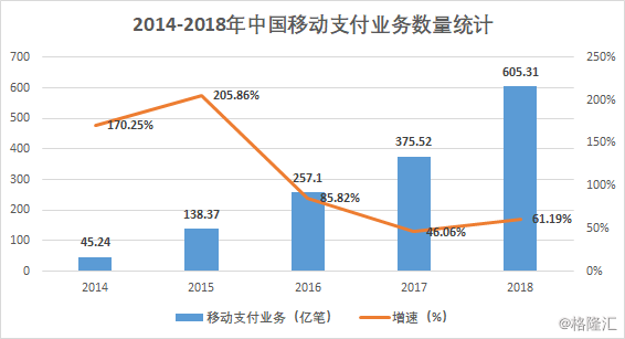 据央行数据,2014年,我国移动支付业务为45.24亿笔,同比增长170.25%;金额达22.59万亿元,同比增长134.30%。到2018年,我国移动支付业务达605.31亿笔,同比增长61.19%;金额达277.39万亿元,同比增长36.69%。