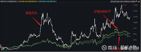 图中是2016年以来,沪深300指数(蓝线)、沪深300ETF(黄线)和京东方A(白线)的走势图。