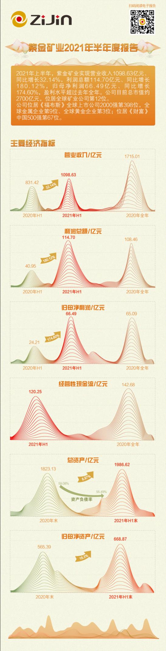 7月30日,紫金矿业发布2021年半年度报告,上半年公司实现归母净利润66.49亿元,同比增长174.6%,超过2020年全年水平。公司主要经济指标实现跨越增长,全面取得了五年规划和十年目标的“开门红”。