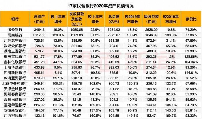 不过网商银行也开始发力,支付宝给予了网商银行更多支持。网商银行2020年总资产增长123%,发放贷款增长81.2%,吸收存款增长108.8%,这些增长指标都远超其他民营行业。