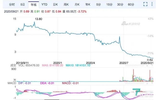 2019年8月15日,玖富集团(JFU.NSDK)在美国纳斯达克上市,发行价为9.5美元/股。而截至发稿,玖富集团的股价已经跌至0.86美元/股,自上市以来股价走势呈一路下滑状态。