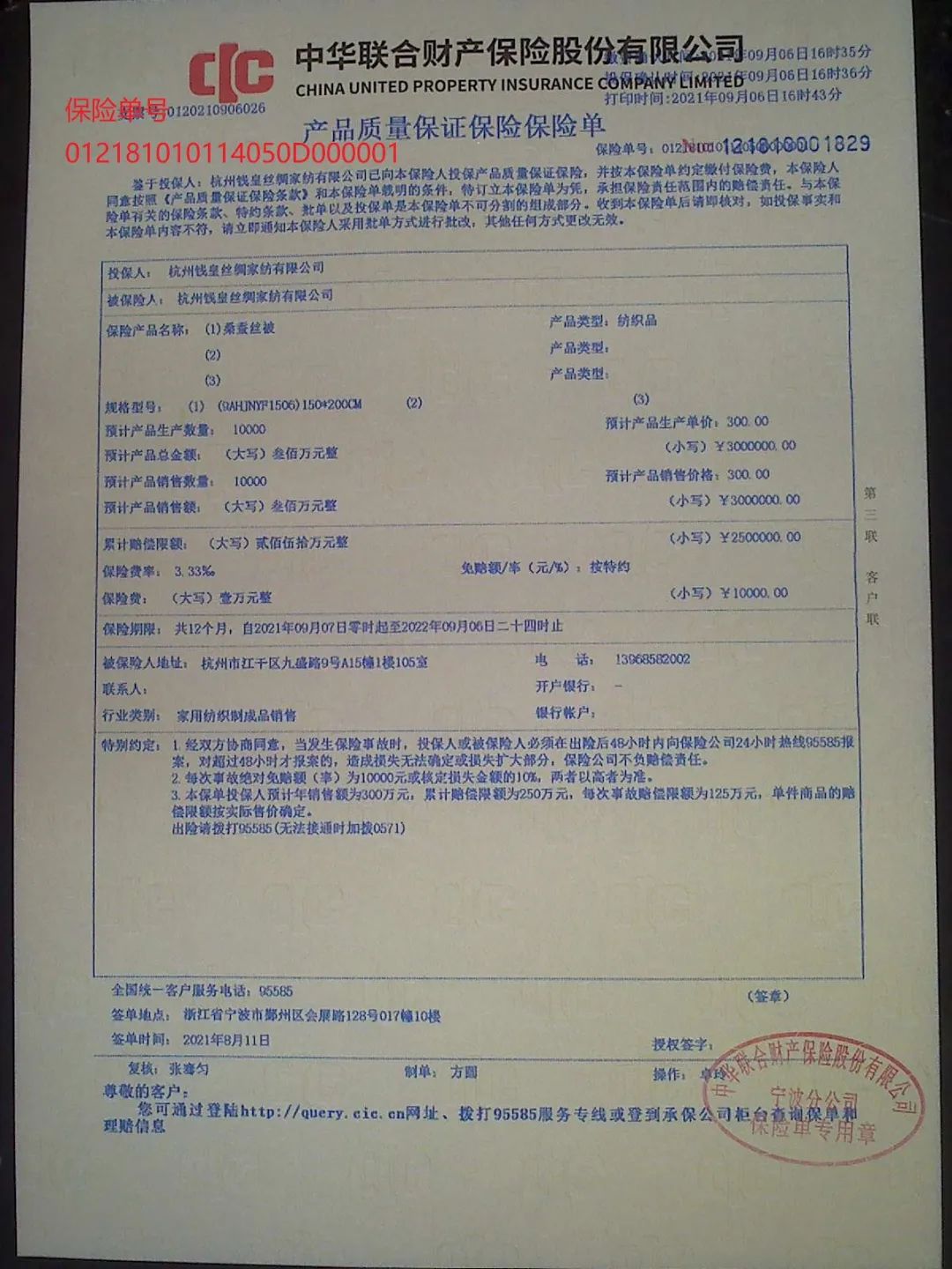 钱皇 100% 桑蚕长丝子母被,品牌承诺假一赔万,由中华保险承担。