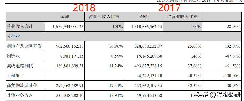 然而,到了2018年,大港股份的集成电路测试收入却又大幅度减少,实现收入仅占总营收11.24%,房地产业务则是卷土重来占比超过了5成。