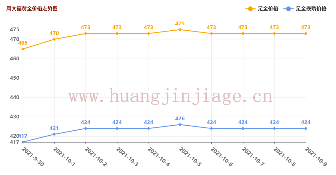 2021年10月9日9:57:国际大盘金价1757.13美元/盎司,国内大盘金价367.28元/克,香港金价18870港币/两,黄金回收价格362元/克,中国黄金基础金价368元/克,周大福黄金价格473元/克(持平),六福黄金价格473元/克(持平),周生生黄金价格472元/克(持平),老凤祥黄金价格477元/克(跌2元),老庙黄金价格473元/克(涨1元),菜百今日金价469元/克,周大生黄金价格473元/克(持平)。以上黄金报价为参考,以店内为准。